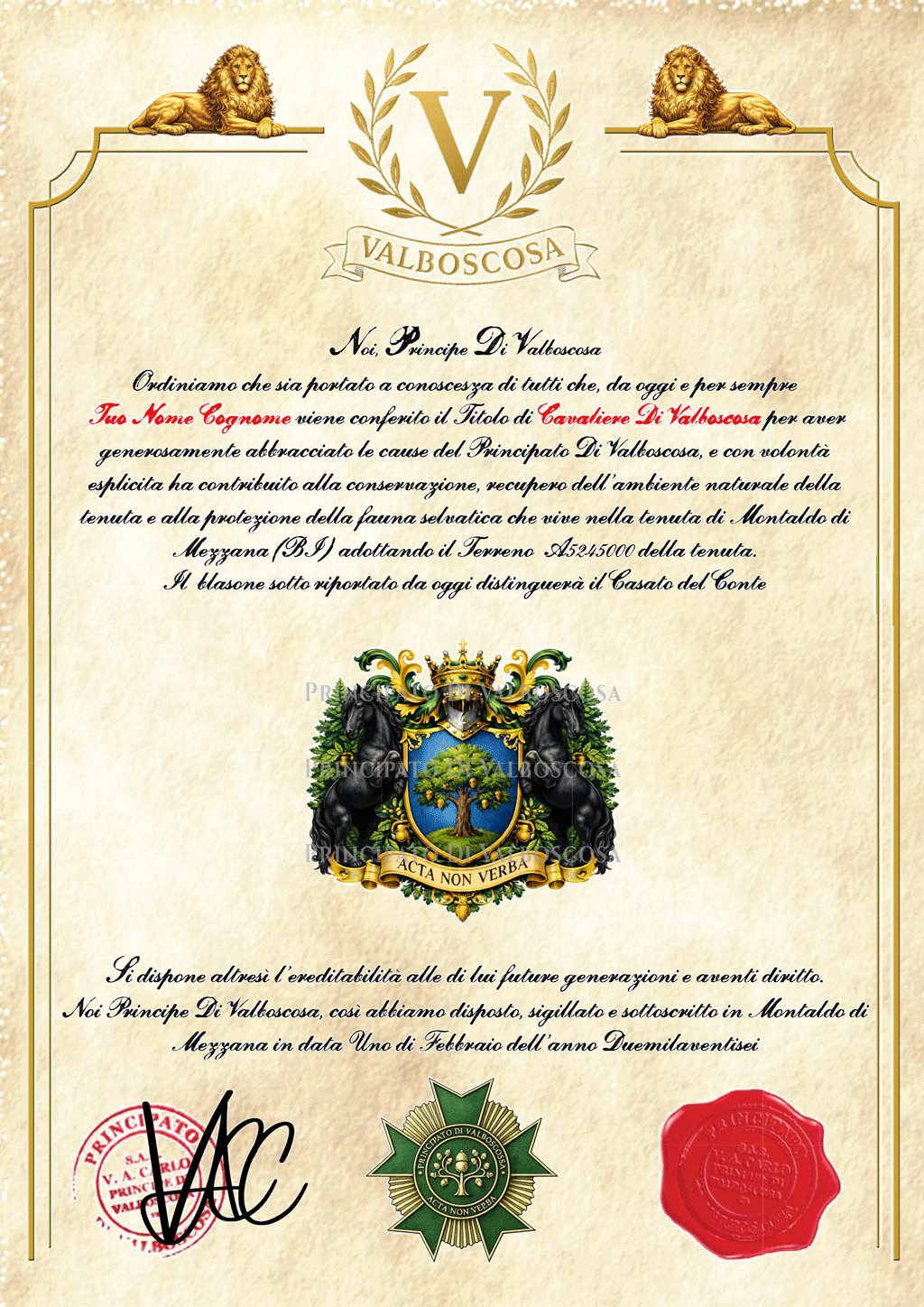 - Titolo Nobiliare “Signore di Valboscosa” con pergamena personalizzata